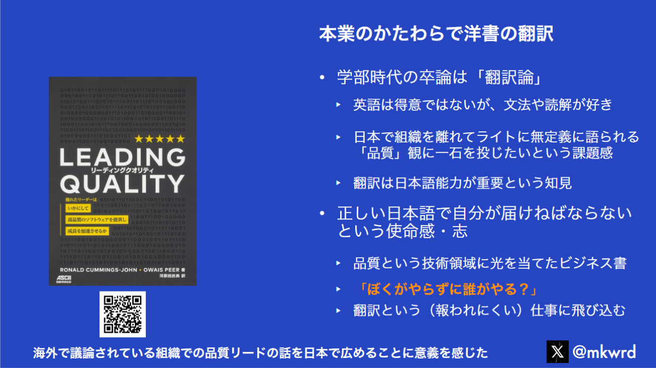 河原田氏は『LEADING QUALITY』という書籍の翻訳を手掛けており、QAエンジニアとしての専門性を持ちながら、翻訳を通じて技術や知識を日本の読者に届けることに使命感を抱いている。その背景には、文系出身という自身のバックグラウンドがある。