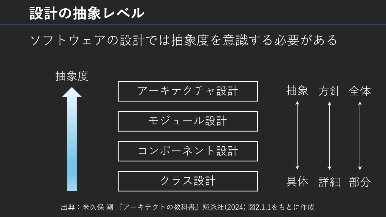 続いて米久保氏は、設計レイヤーにおける抽象度の扱いにも言及。アーキテクチャ、モジュール、クラスといった階層構造は、抽象から具体への移行を段階的に進めるためにある。各層で「何を抽象化し、どこまで詳細化するか」を意識することで、設計の迷いを減らせるという。