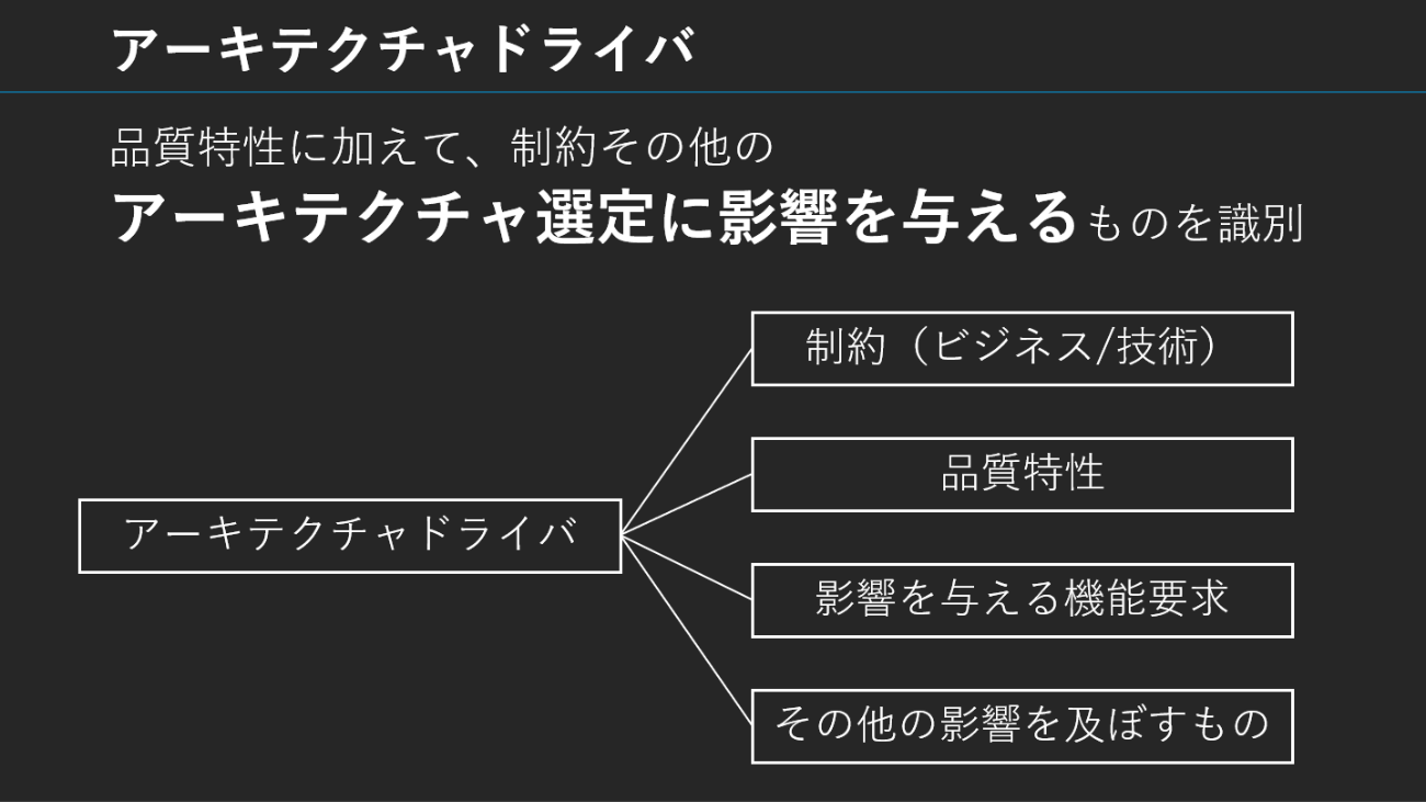 その出発点として米久保氏が挙げたのが「アーキテクチャドライバ」だ。業務ドメイン、規制、戦略、対象ユーザーなど、設計に影響を与える文脈要素を抽出し、それに基づいて判断していくべきだとする考え方である。