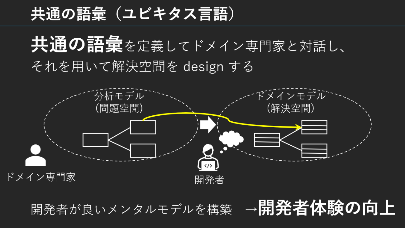 米久保氏は、開発者こそがこの「橋渡し役」を担っていると強調する。なぜなら、問題空間(分析モデル)と解決空間(ドメインモデル)の両方を扱えるのは、開発者しかいないからだ。そして両者をシームレスに往復するためには、会話で使われた語彙とコードに登場する語彙を一致させる工夫――「共通の語彙の定義」が重要だ。クラス名やメソッド名がドメインの用語と一致していれば、認知負荷は大きく下がる。構造的にも概念モデルとの対応が取れていれば、設計意図のズレも減らせるというわけだ。