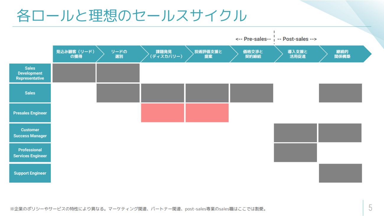 商談が成立した後のフェーズ、すなわちPost-salesにおいては、契約締結や導入支援、ユーザー教育、継続利用の促進といった活動が中心となり、ここではカスタマーサクセスマネージャーやプロフェッショナルサービス、サポートエンジニアが活躍する。プリセールスエンジニアはその前段階で顧客の信頼を得て、製品導入の意思決定を引き出す役割を担っているため、BtoB領域において極めて重要なポジションだと言える。