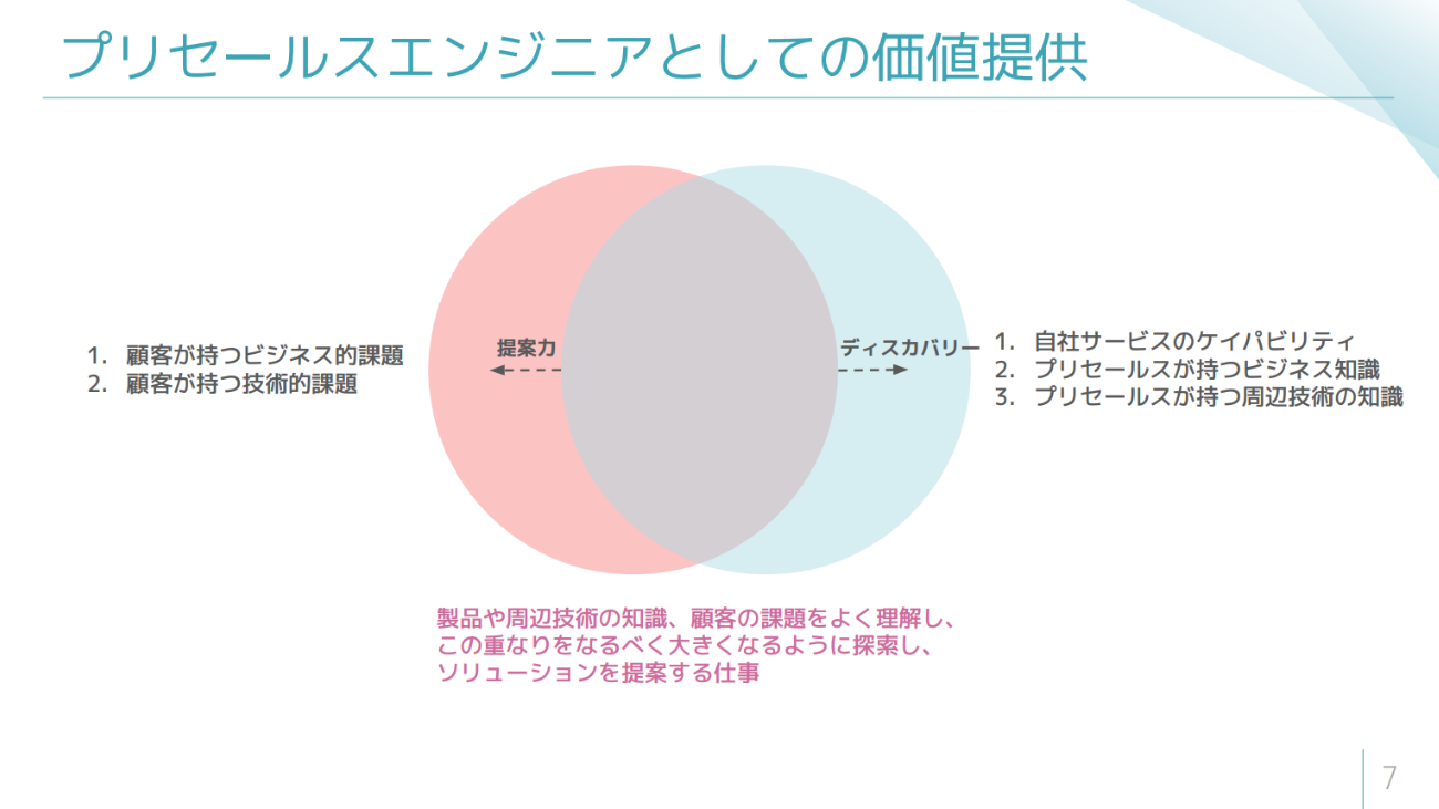 こうした役割の本質を視覚化したのが、伊藤氏が提示した「課題とケイパビリティの交差点」を軸とする概念モデルだ。片側には顧客の持つビジネス/技術課題、もう一方には自社サービスの特性やプリセールスのスキルセットが配置され、それぞれの重なり合いが提案の質を規定する。