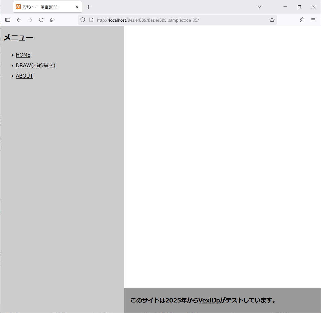 最初は、前回作成した三角形のベジェ曲線図形しか出てきません。しかし、お絵描きページを作ってお絵描きを保存できるようになったら、さまざまなベジェ曲線図形が出てきます。実は、お絵描き自体はどのページでもできますが、お絵描きページでなければ作成したベジェ曲線データはデータベースに保存できません。