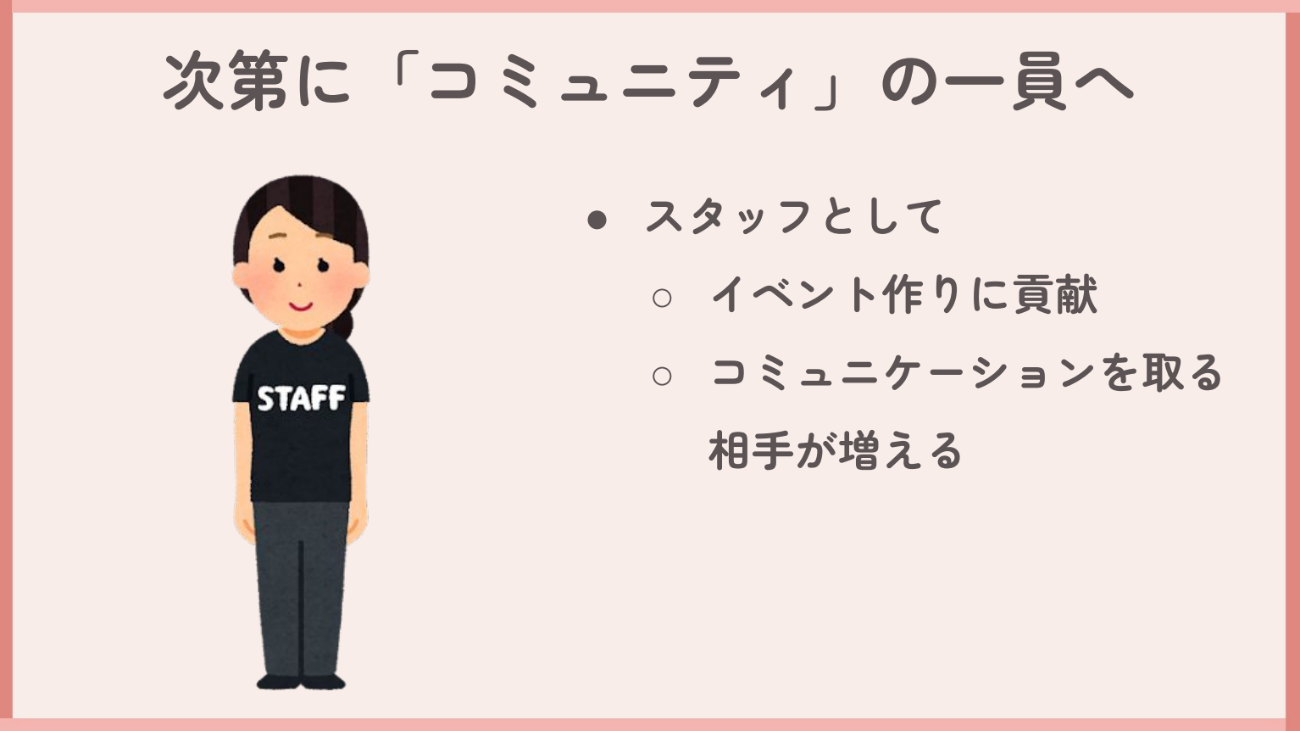 たとえ懇親会などでの交流が苦手でも、スタッフという立場なら、無理なく多くの人と関われる