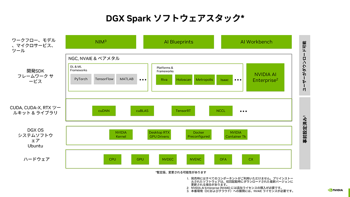 高橋:DGX OSはLinux(Ubuntu)ベースのOSで、NVIDIAが提供するフレームワークはもちろん、サードパーティー提供のフレームワークもお使いいただけます。DGX Station、DGX Cloudなどでも使われていますので、DGX SparkとDGXシリーズの製品間でワークロードをシームレスに移動することができます。