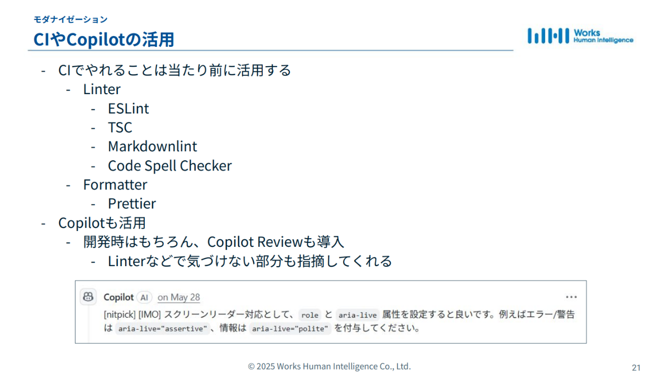 こうした課題に対して、モジュール分割(フロントエンドの分離)、CIやCopilotの活用、アクセシビリティチェック、部署全体への啓発活動によって解決を図った。