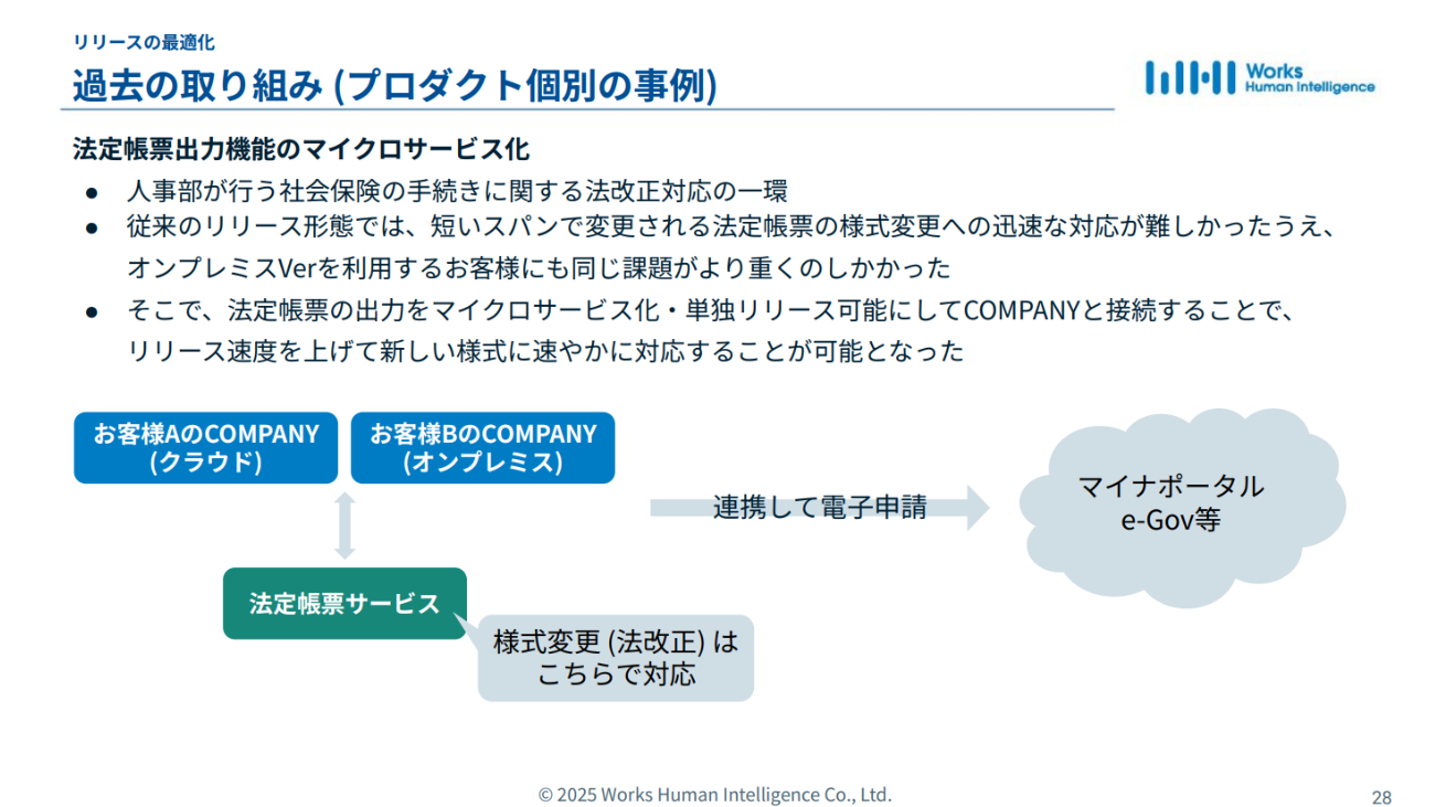 マイクロサービス化として先行したのが法定帳票出力機能だ。社会保険の手続きに関する法改正対応の一環で、法定帳票の出力をマイクロサービス化して「COMPANY」と接続することで、新しい様式に速やかに追従することが可能となった。
