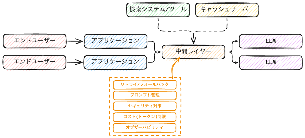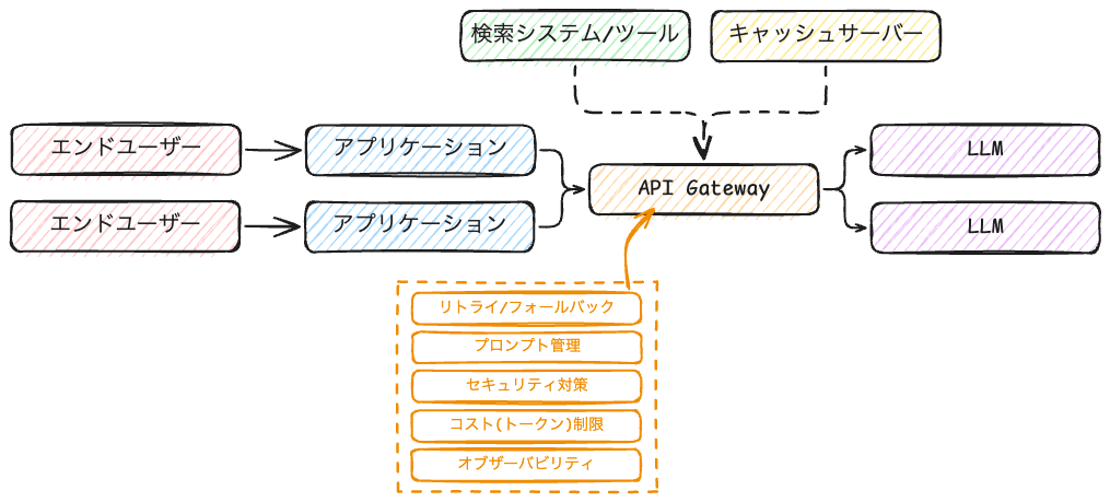 さて、このAPI Gatewayですがマイクロサービスアーキテクチャのような構成に限らず[中央集権的なレイヤーを用いるアプローチ](#中央集権的なレイヤーを用いるアプローチ)で述べた通り、LLMを活用したアプリケーションでも有効活用することができます。
