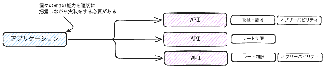 まずは、API Gatewayについて説明します。下図は、API Gatewayを用いずにクライアントアプリケーションから直接APIサーバーに通信を行っている様子です。APIエンドポイント自体が増えることも実装や管理の点で面倒ですが、それ以上にAPIの能力を適切に把握しながら実装する必要があることも課題です。「APIの能力」とは、例えばどのような認証方法がサポートされているのかやレート制限が挙げられます。
