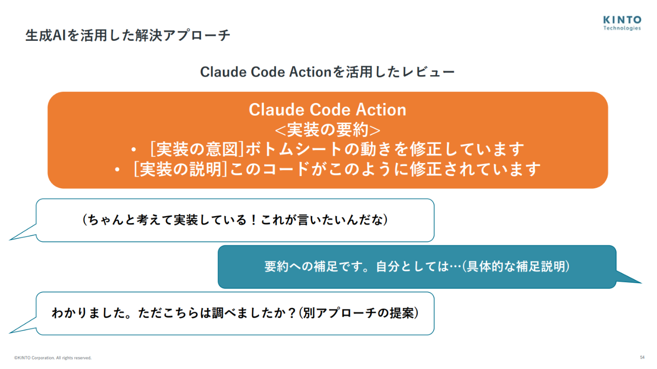 先に挙げたボトムシートの不具合修正の事例にあてはめてみよう。Claude Code Actionに実装を要約してもらい、レビュアーはその要約を見て実装の目的を把握する。それに対して実装者が「この仕様・機能を実現するために、この実装を行いました。私はこのような理解をしています」と補足することで、レビュアーは実装者の理解度を測ることができる。これにより、正解のコードに到達するまでの長いやり取りを削減し、コミュニケーションコストの削減につなげることができるのだ。