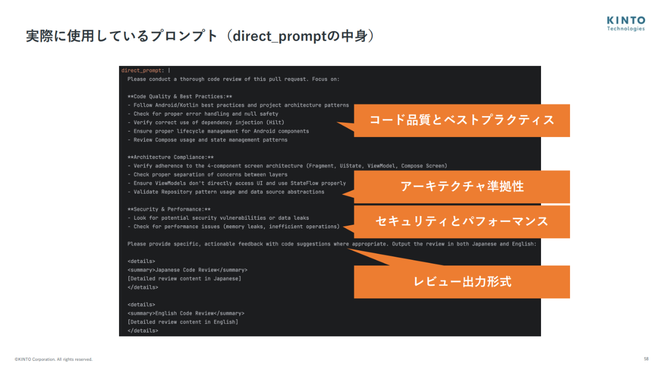 レビュー観点は「コード品質とベストプラクティス」「アーキテクチャ準拠性」「セキュリティとパフォーマンス」「レビュー出力形式」の4項目に大別される。これらの観点から「ガイドライン違反を機械的に洗い出すことで、レビューの観点漏れを防ぐことができます」と、小林氏は自動化ワークフローへの導入効果を説明する。