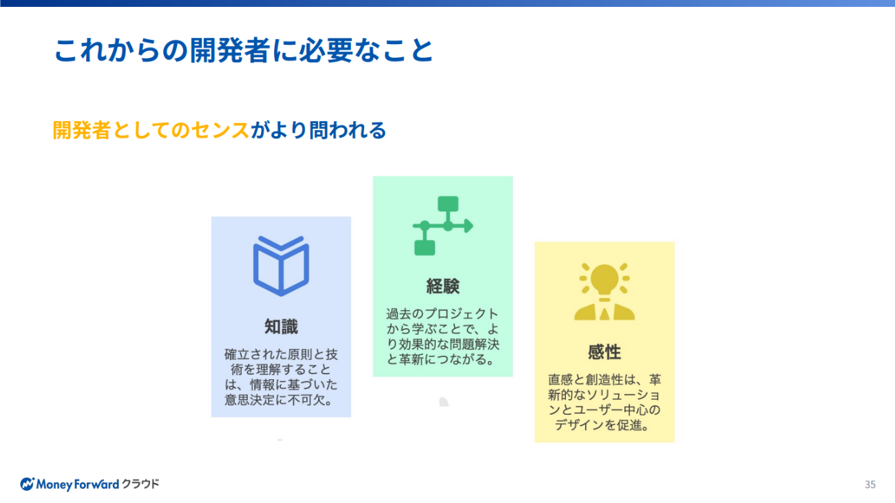 その時、開発者に求められるのは「開発者としてのセンス」である。確立された原則などの知識のほか、過去のプロジェクトでの経験、ユーザー中心のデザインを実現する直感や創造性といった感性も問われるようになる。