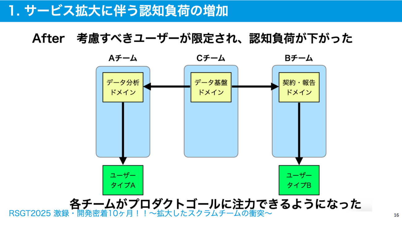 第1の課題はサービス拡大に伴う認知負荷の増加だ。アジャイル内製センターは、サービス拡大のためにメンバーを増員しながら活動してきた。開発人員が増えてプロダクトも成長していく一方で、開発側の認知負荷が増加していく問題が発生した。「メンバーを増やしてもシステムが複雑化していくため、チームで扱っているドメインの領域が広がり、考えるべきこと、知るべきことが増えてしまった」と当時のチームの状態を振り返る。