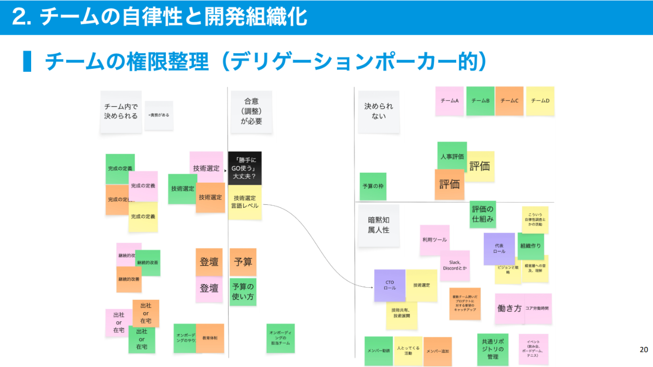 具体的には「チーム内で決められること」「チーム間で合意が必要なこと」「決められないこと」「チームの自律性によって実現しないもの(暗黙知、属人性)」の4つである。「チーム間で認識が揃っていないことを、きちんと揃えていき、揃っていることを確認していきました」(森鳰氏)