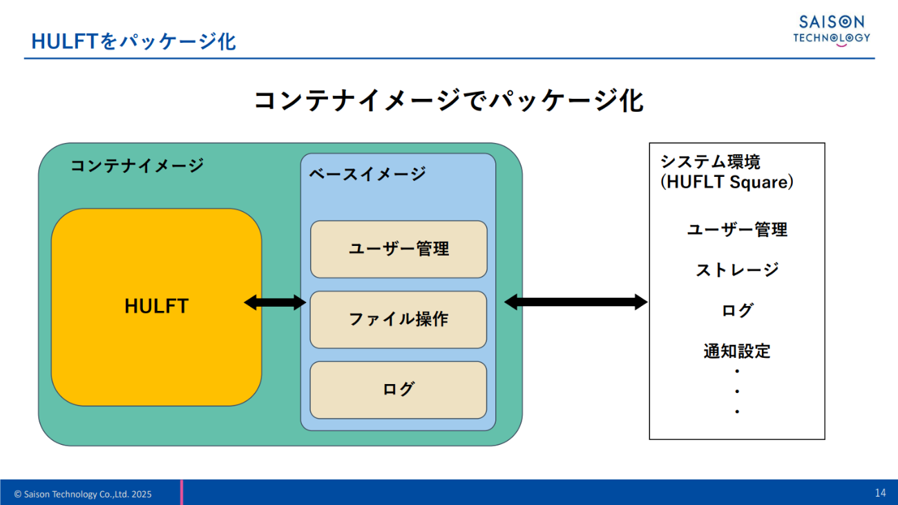 とはいえ、「ただコンテナでHULFTを動かしているだけでは、HULFT SquareでHULFTの機能を提供したとは言えず、意味がないことが分かった。そこで少し工夫をした」と畑氏。それがコンテナイメージでパッケージ化するという方法である。具体的にはコンテナイメージ内にベースイメージを設け、そこにHULFT Squareと連携する機能を改良して実装したのである。「こうすることでHULFTは一切変更を加えることなく、HULFT Squareのユーザー管理やストレージを使えるようになると考えた」(畑氏)