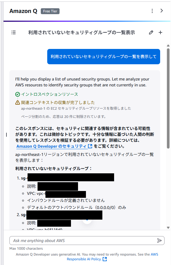 筆者の環境で利用されていないセキュリティグループ一覧を取得するように質問してみると、日本語での質問を理解したうえで、実際の環境に基づき、セキュリティグループの一覧を提示してくれました。