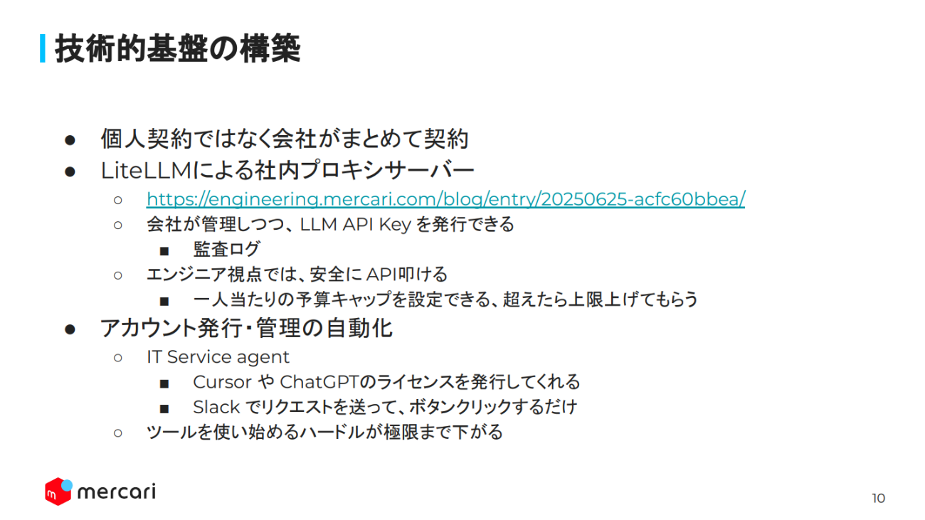 メルカリでは、AIツールの利用契約を個人ではなく、会社がまとめて行う。これによって、例えばGitHub Copilotの場合は、チームプランの設定で強制的に社員が入力したプロンプトをコード学習から切り離すことができる。他にもLLMプロキシサービスの「LiteLLM」というサービスを使えば、「誰がなんの入力をして、どんな返答がきたか」を会社として記録することが可能だ。