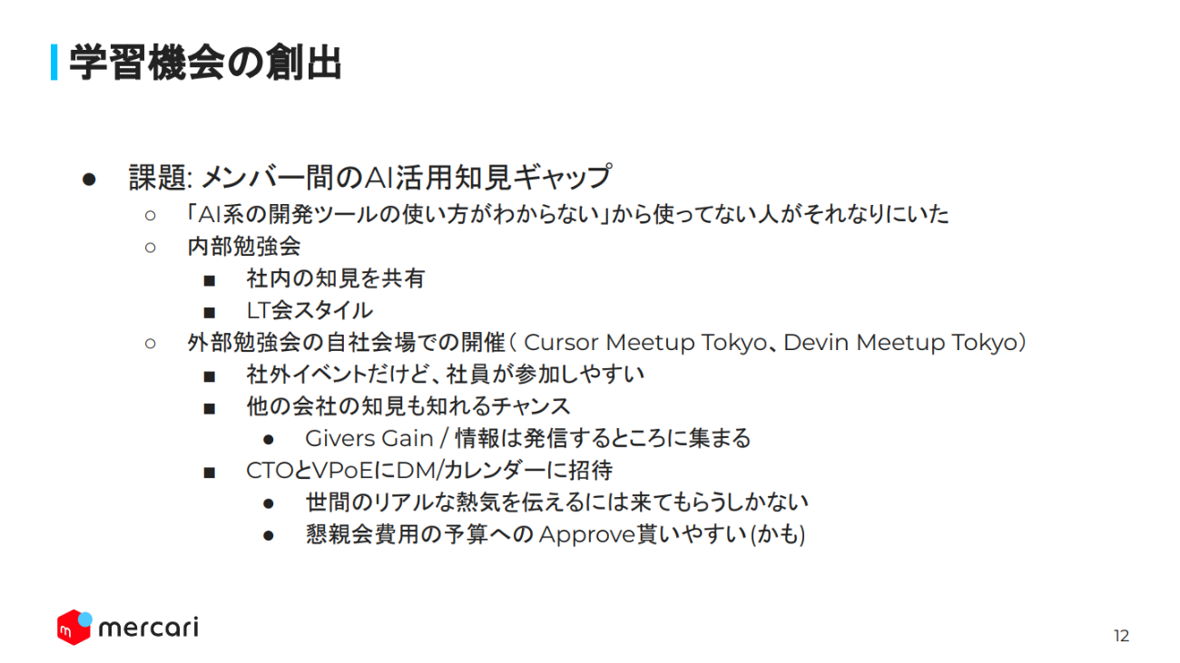 この外部勉強会には、一般社員だけでなく、CDOやVPoEも積極的に招待。マネジメント層にもリアルの熱気を体感してもらうことで、例えば予算面での考慮など、開催にあたってのハードルを少し下げることができた。