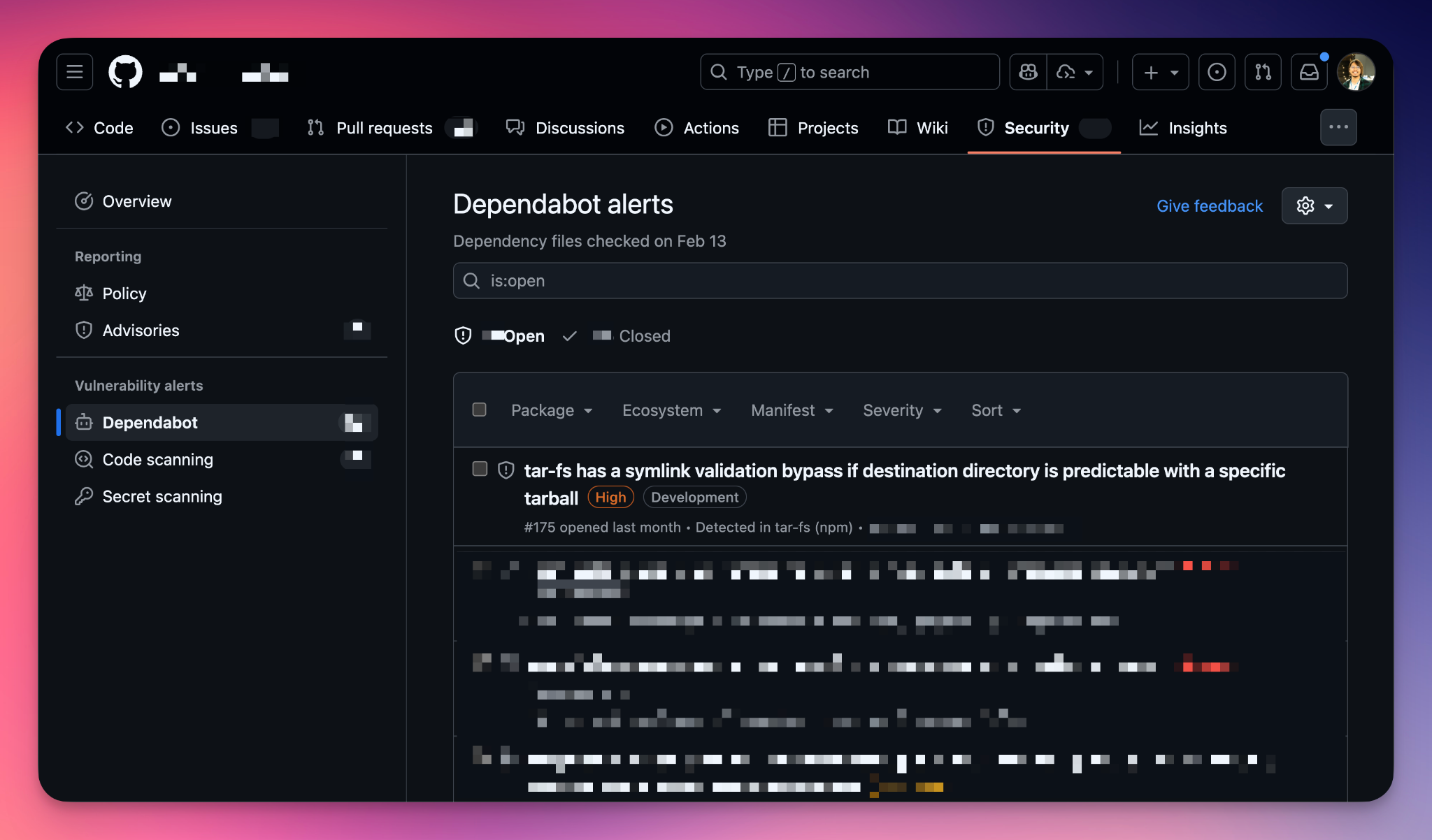 例えば、Githubの「Dependabot Security Updates」を利用すると、リポジトリのセキュリティタブから、利用中の依存関係に問題があるかを簡単にチェックできます。