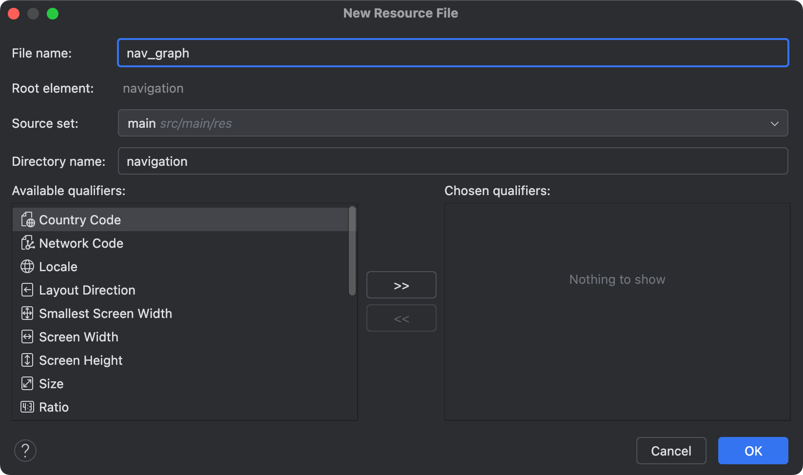 リスト4の(2)の属性値からもわかるように、ナビゲーショングラフはres/navigationフォルダに作成することになっています。ファイルそのものは、作成したnavigationを右クリックし、「New > Navigation Resource File」メニューを選択することで表示される図4のウィザード画面を利用するのが便利です。