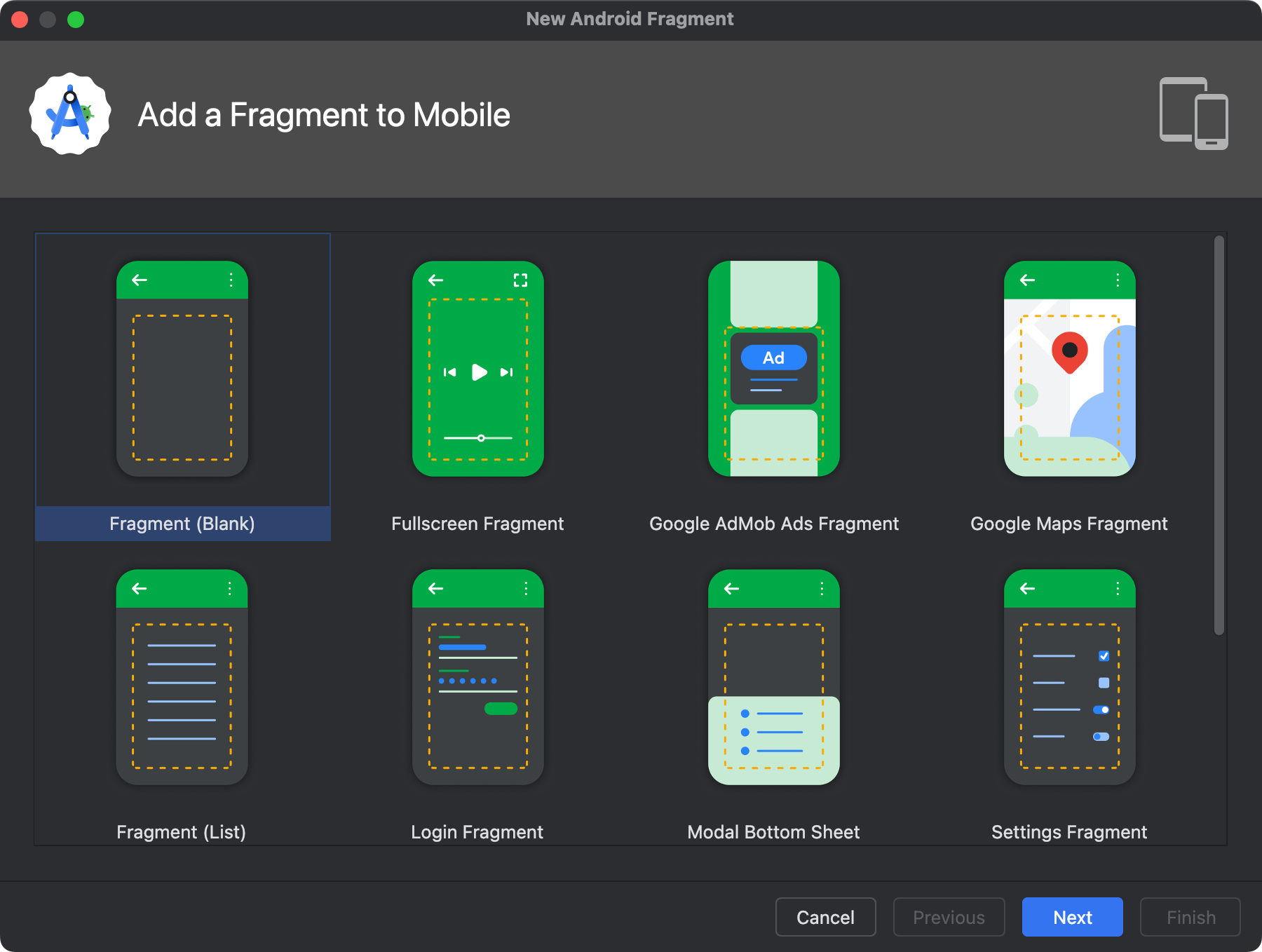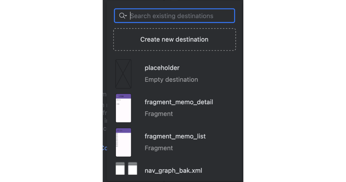 あらかじめプロジェクトにフラグメントが存在する場合は、それがリスト表示されます。一方、[Create new destination]を選択することで、図7のフラグメントの追加ウィザードが起動するので、そこから新規に追加することもできます。