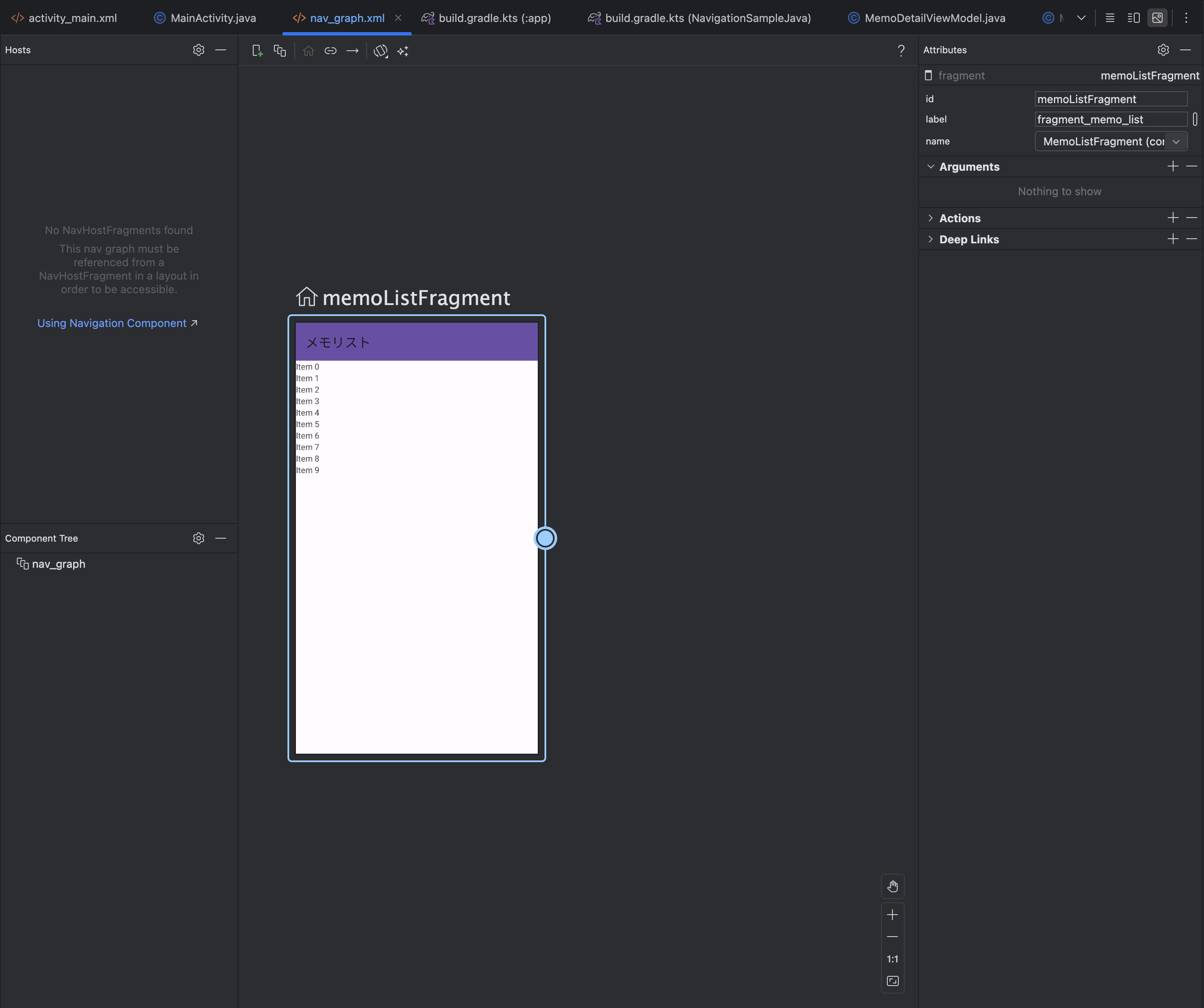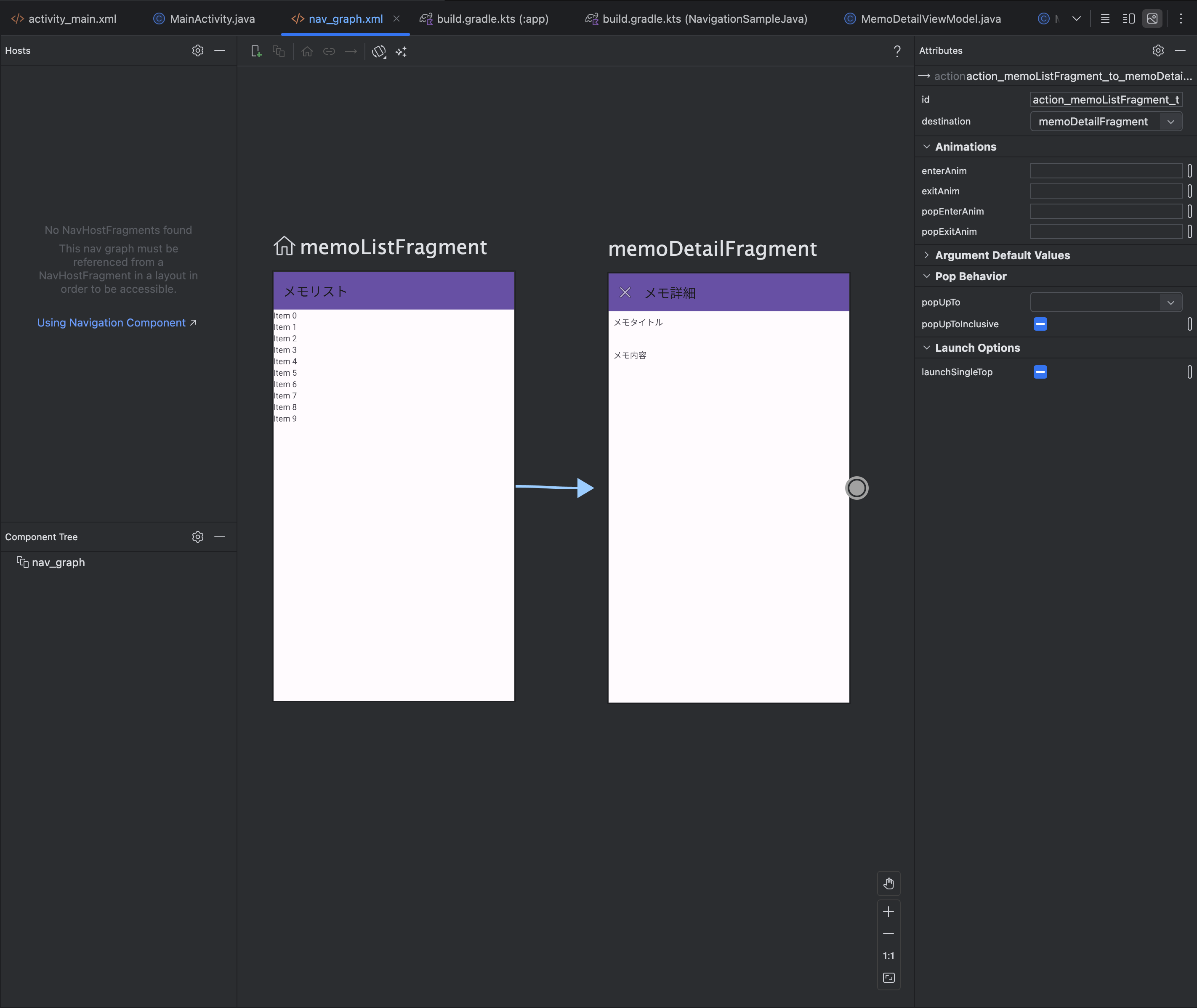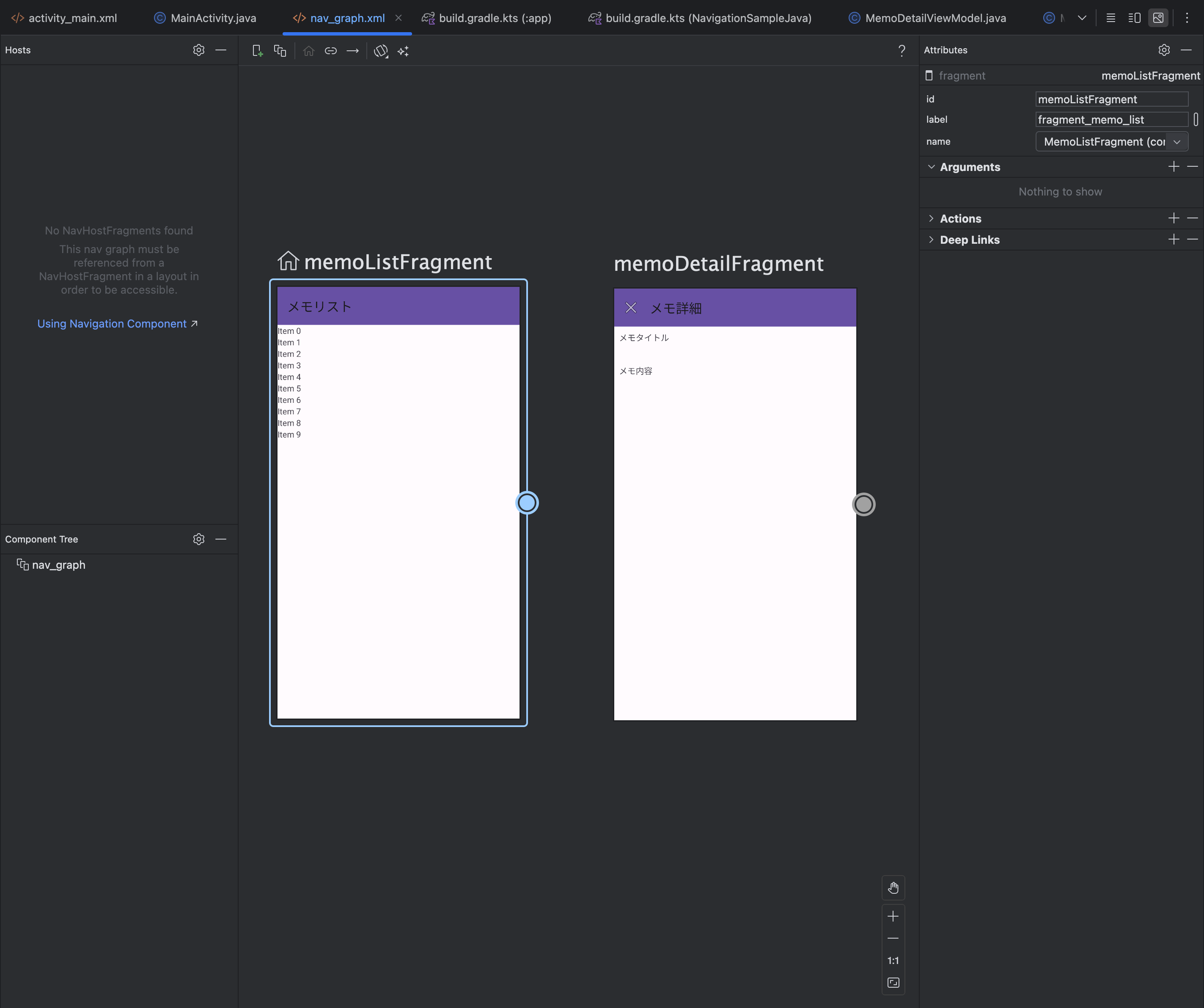 各デスティネーションは、(4)のfragmentタグで定義します。これらもナビゲーションエディタ上で追加するだけで、属性も含めて自動で設定してくれます。