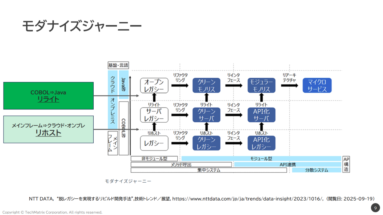 例えば、まずはメインフレームをクラウドやオンプレミスに置き換え、そのリホストが成功したら、次にCOBOLからJavaへのリライトに着手する……といった形で段階的にモダナイズを進めていくのだ。