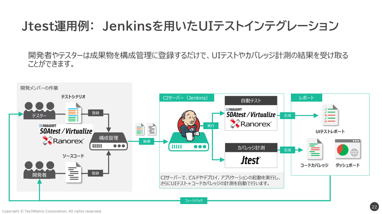 常盤氏はJtestの運用例として、Jenkinsを用いたUIテストインテグレーションのケースを挙げた。JenkinsをCIサーバーとして立てて、UIテスト自動化ツール・APIテスト自動化ツールを実行しながらすべてのテストを網羅的に行いたい場合だ。