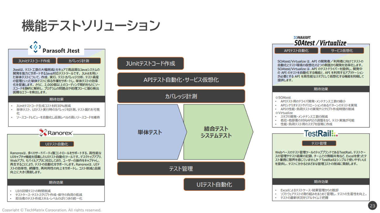 ここまで、金融業界の無影響確認テストの効率化に役立つ3つのツールが紹介された。最後に常盤氏は、テクマトリックスが提供する「機能テストソリューション」についても紹介した。