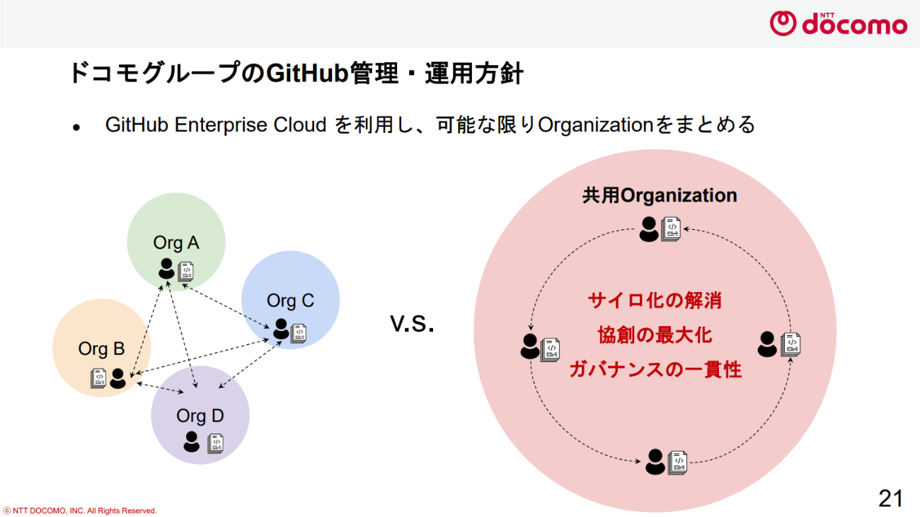 大規模組織がGitHubを利用する際、部門やプロジェクトごとに「Organization(組織)」を分割して管理するケースが散見されるが、NTTドコモでは原則として「共用Organization」を利用する方針をとっている。森谷氏はその理由として、組織やプロジェクトを横断してコードを検索・参照できる環境を作ることで「車輪の再発明」を防ぎ、組織の壁を超えたコラボレーション(InnerSource)を醸成するためだと説明した。また、セキュリティポリシーを統一的に適用できるため、管理・運用コストの削減にもつながり、管理者と利用者の双方にメリットがある運用形態だという。