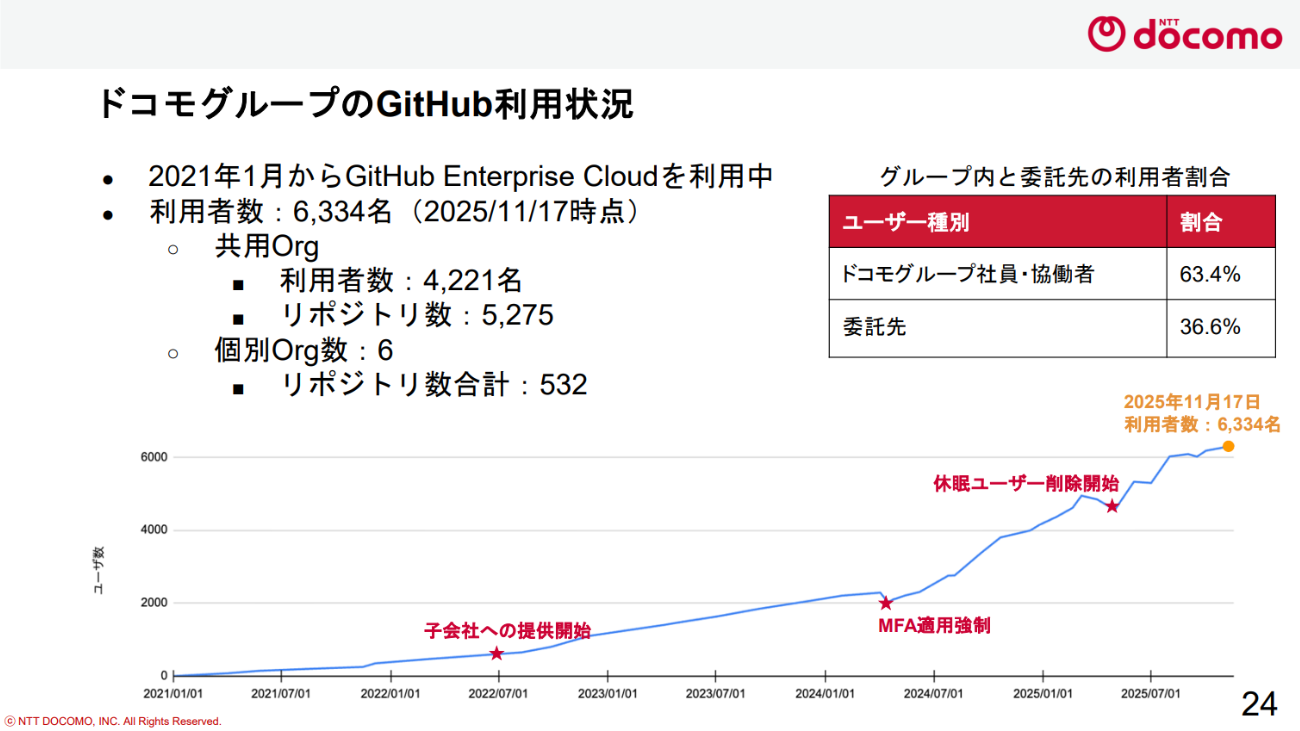 現在、同グループのGitHub利用者数は6,334名(2025年11月17日時点)にのぼるが、そのうち約3分の2にあたる4,221名が共用Organizationを利用しており、リポジトリ数で見ると全体の約90%が集約されている。なお、機密情報を扱う場合はPrivateリポジトリを利用するものの、原則は社内で閲覧可能なInternalリポジトリを推奨し、Publicリポジトリの利用は禁止することで、情報の透明性とセキュリティのバランスを保っている。