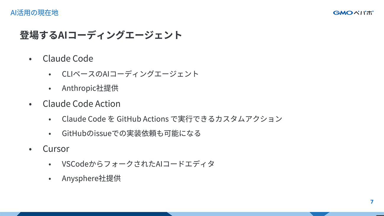 1つ目はClaude Codeで、Anthropic社から提供されているCLIベースのAIコーディングエージェントである。2つ目はClaude Code Actionsで、Claude CodeをGitHub Actionsで実行できるカスタムアクションであり、GitHubのIssueで実装指示を出すとAIが実装してくれる環境を実現できる。3つ目はCursorで、Anysphere社から提供されているVS CodeからフォークされたAIコードエディターである。
