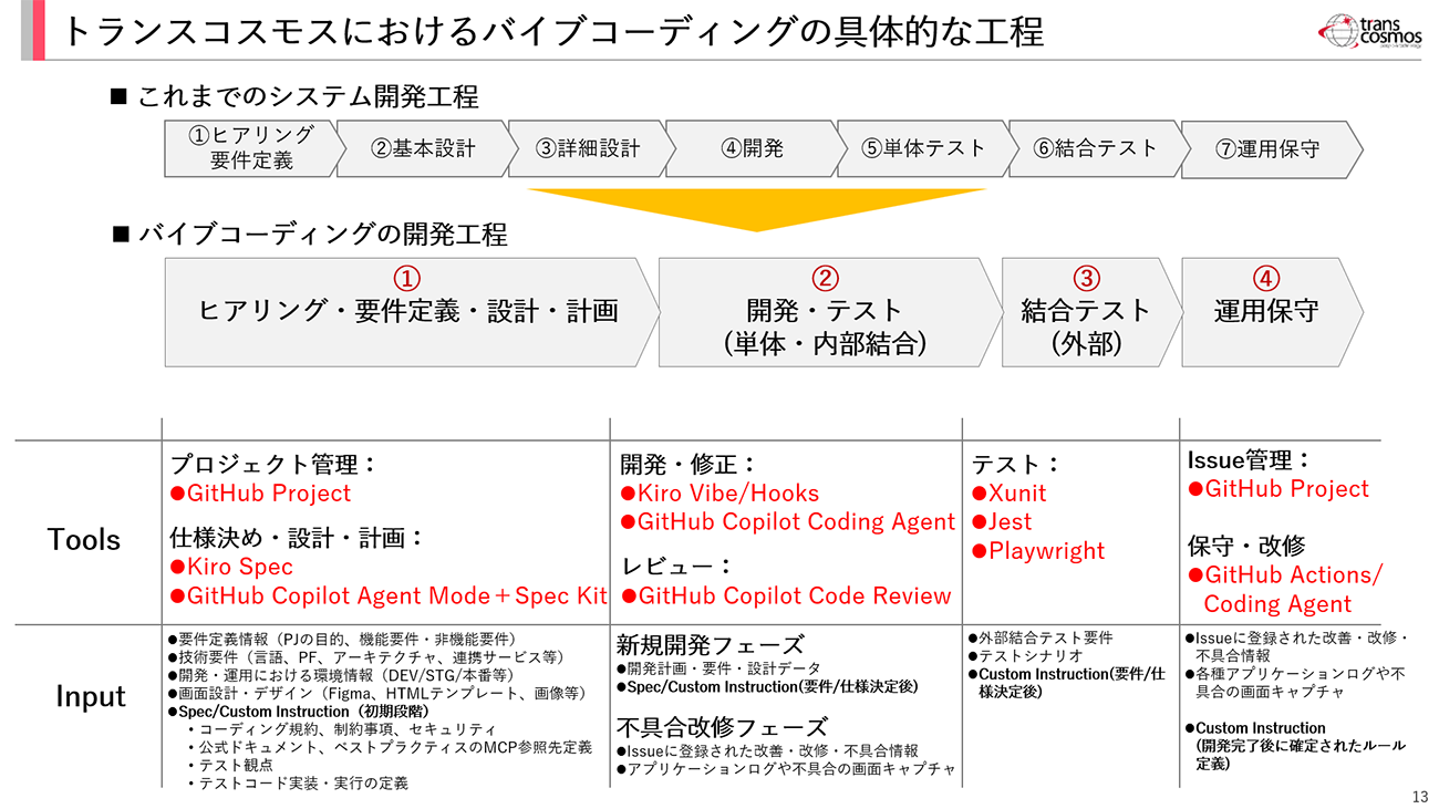 各工程では使用するツールとインプット内容を明確に定義している。要件定義・設計・計画の工程では、AWSの「Kiro Specs」やGitHub Copilotの「Agent Mode」を使用し、機能要件、非機能要件、アーキテクチャ、環境設定に加え、コーディングルールやデザインポリシーもインプットしていく。