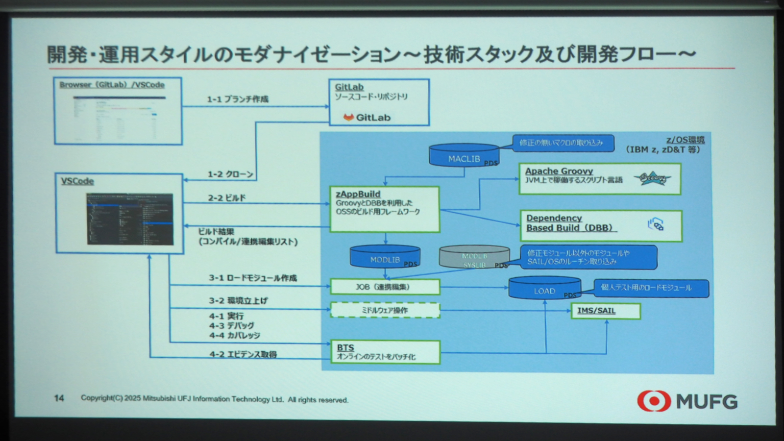 コード生成後のビルドプロセスも完全にモダン化されている。TSOに切り替えることなく、VS Codeのメニューから「IBM User Build」を実行すると、Gitで管理された変更分のソースのみがメインフレームへ転送される。裏側ではIBM Dependency Based Build(DBB)とGroovyスクリプトが動作してJCLを自動生成し、コンパイルを実行する。エンジニアはローカルPC上のIDEから離れることなく、メインフレーム上のアプリケーションを開発・ビルドできるようになったのである。
