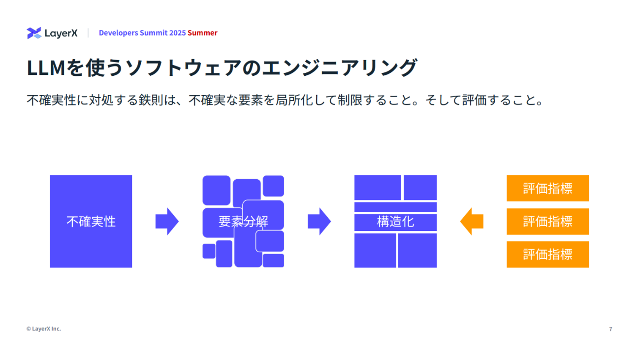 そこで澁井氏が提示した鉄則は、「不確実な要素を局所化し、制限し、評価する」方針だ。ビジネスロジックのように確定的に制御できる部分はルールベースで固め、LLMが関与する領域では「どこが不確実なのか」を構造的に分解し、影響範囲を最小化する。揺らぎをソフトウェア全体に波及させない設計こそが重要だと述べる。