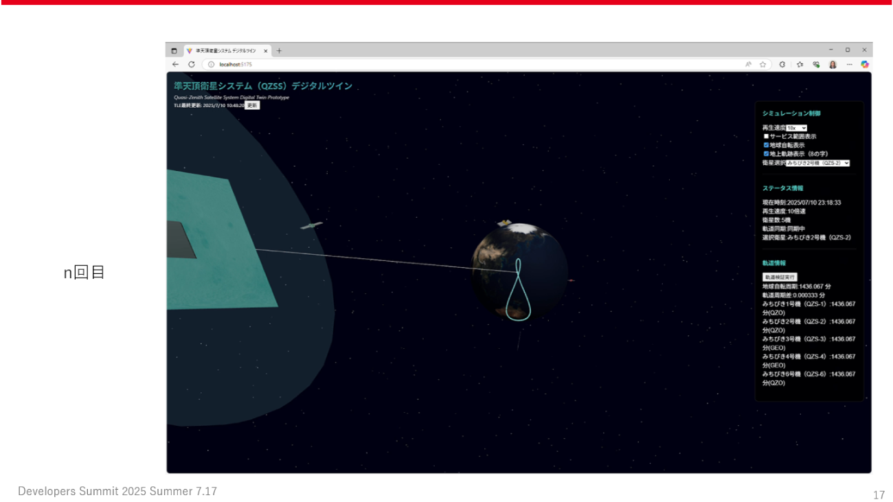 ここで奥田氏はバイブコーディングのデモンストレーションとして、自作の簡易衛星シミュレーターを紹介した。「準天頂衛星のシミュレーターを作りたい」と指示すると、AIは即座に初期コードを生成し、動作する画面を構築。「表面をもっとリアルに」「軌道を物理法則に合わせて修正して」とフィードバックを与えると、描画や挙動の精度が段階的に向上していった。人間はコードを書かず、生成されたプロトタイプのレビューと指示に専念することになる。