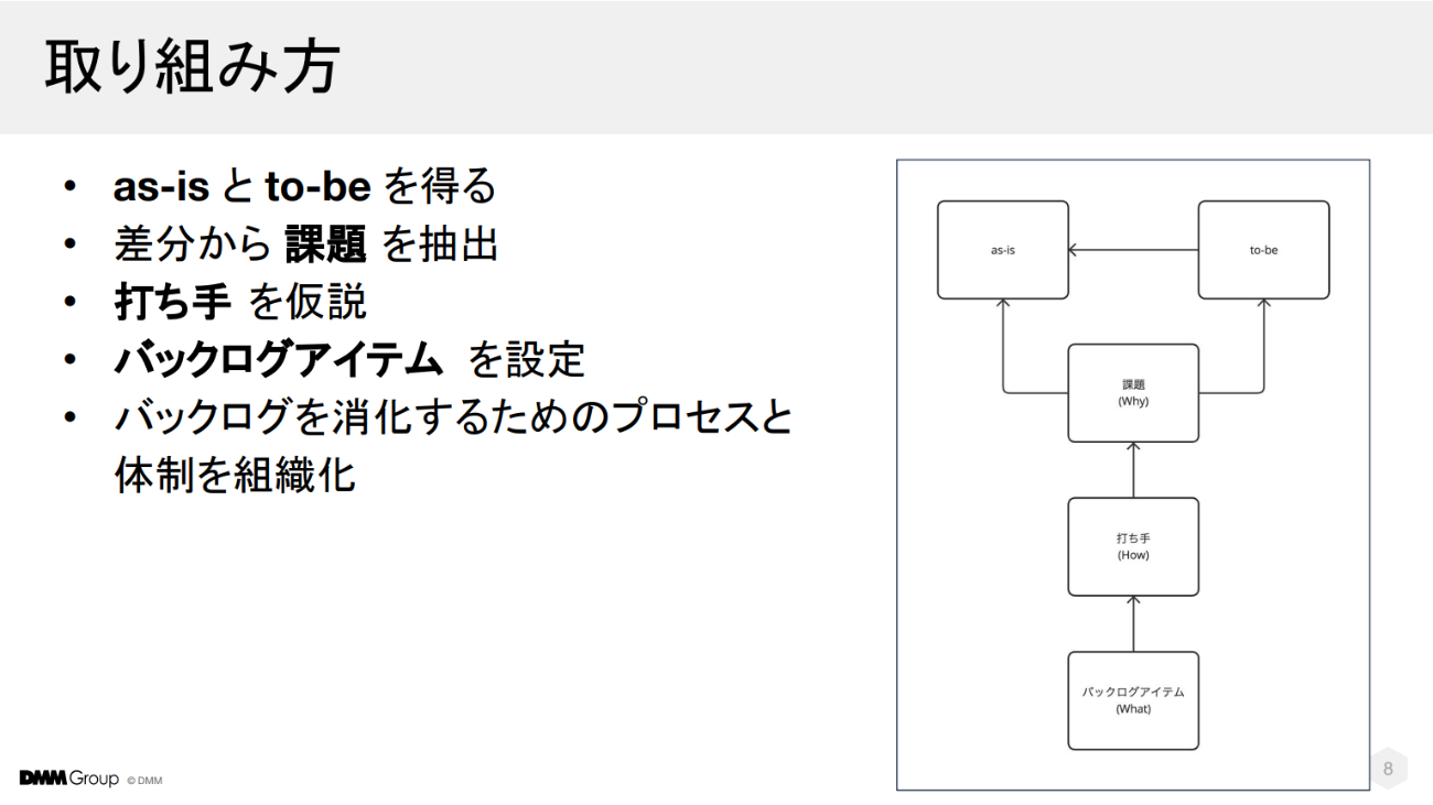 藤井氏がまず着手したのは、改善戦略の策定だ。3〜5年という中長期的な視点で、現状把握と課題の言語化に徹底的に時間を投じた。採用したのは、「As-Is」「To-Be」「課題(Why)」「打ち手(How)」「バックログ(What)」という改善フレームワークだ。