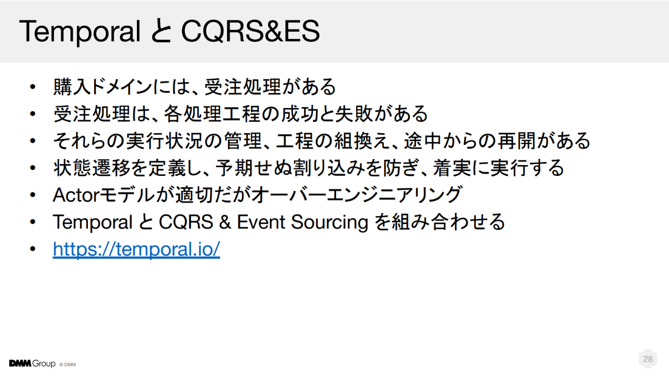 この構造的課題に対し、藤井氏が選択したのがTemporalとCQRS&Event Sourcing(ES)を組み合わせたアーキテクチャだ。ESにより状態変化をイベントとして永続化し、CQRSで読み書きを分離して独立性を確保することで、障害時には処理の巻き戻しや部分的再実行を安全に行える。さらにTemporalのワークフロー管理は、長期実行処理の安定性を担保しつつ、購入処理に見られる段階的な成功・失敗という性質にも対応できる。「両者の相性は非常に良い」と藤井氏は説明する。