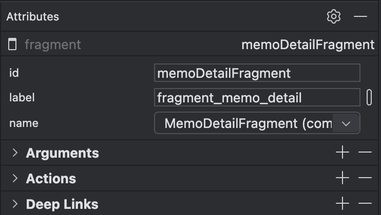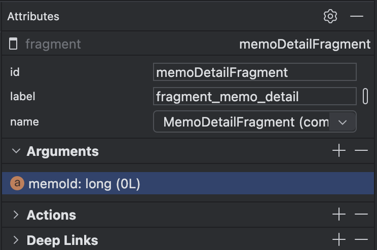 一方、画面遷移時に型安全でのデータの受け渡しを行う場合、まず、ナビゲーショングラフの遷移先デスティネーションに受け取るデータを登録する必要があります。ナビゲーショングラフにおいてmemoDetailFragmentを選択すると、Attributesツールバーは、図1の表示となっています。