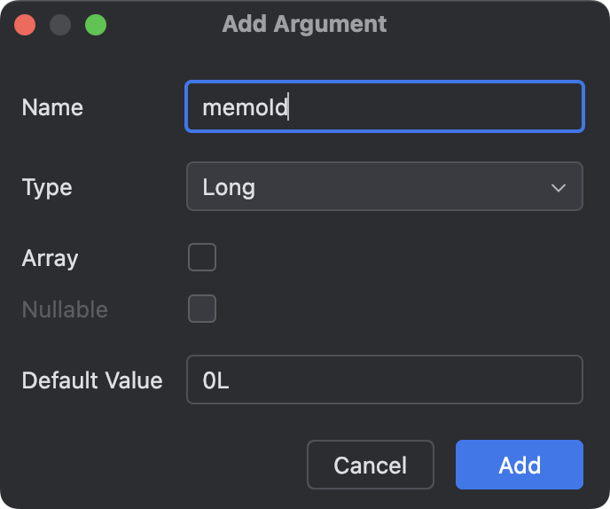 先述のように、MemoDetailFragmentは主キーidの値を受け取る必要があるので、図2のように、name(データ名)をmemoId、type(データ型)をLongとし、さらに、データをうまく受け取れなかった場合のための初期値(Default Value)として0Lを入力し、[Add]をクリックします。