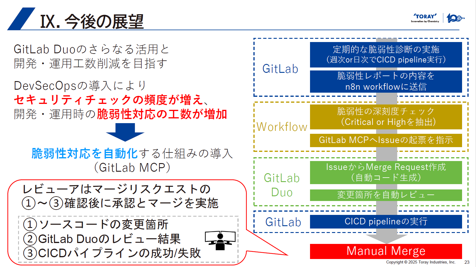 この点について、同社では脆弱性対応を自動化する仕組みを導入しようとしている。GitLabで週次や日次でパイプラインによる脆弱性診断を行い、そのレポートをワークフロー管理ツール「n8n」に送って、深刻度をチェックする。その後、GitLabへIssueの起票を指示し、GitLab Duo内のマージリクエストからコードを自動生成する。さまざまな機能を組み合わせて、レビュアーの負担が減る仕組みを構築中だ。「全ての脆弱性対応を自動化するのは難しいが、まずは簡単な部分から取り入れてレビュアーの負担を下げていきたい」と、塙氏はその狙いを話す。