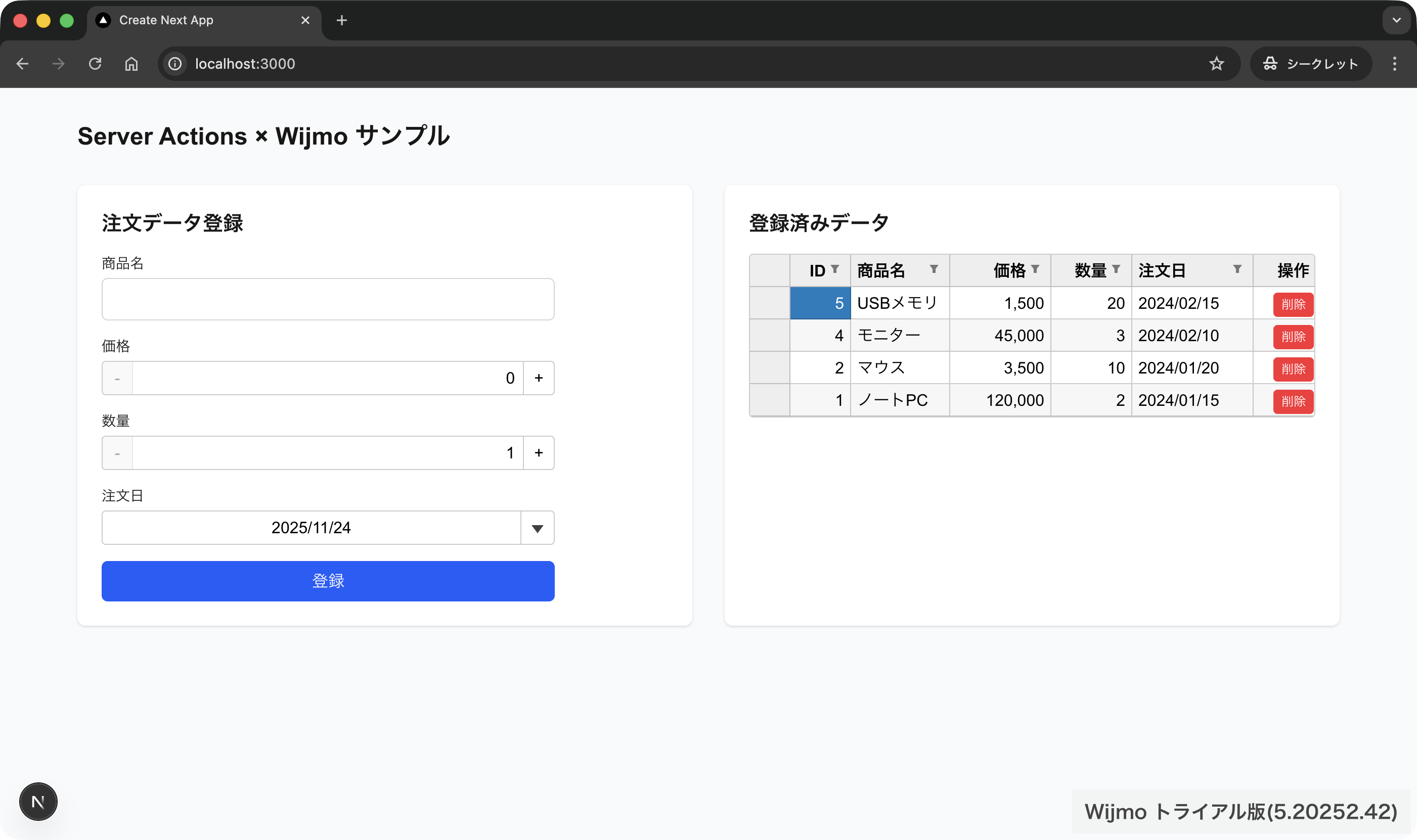 本記事では、商品注文データを管理するCRUDアプリケーションを実装します。WijmoのInputNumberやInputDateコントロールを使った登録フォーム、FlexGridによるデータ一覧表示とインライン編集、ソート・フィルター機能、削除ボタンを備え、すべての機能がServer Actionsを通じてサーバーサイドと連携します(図1)。