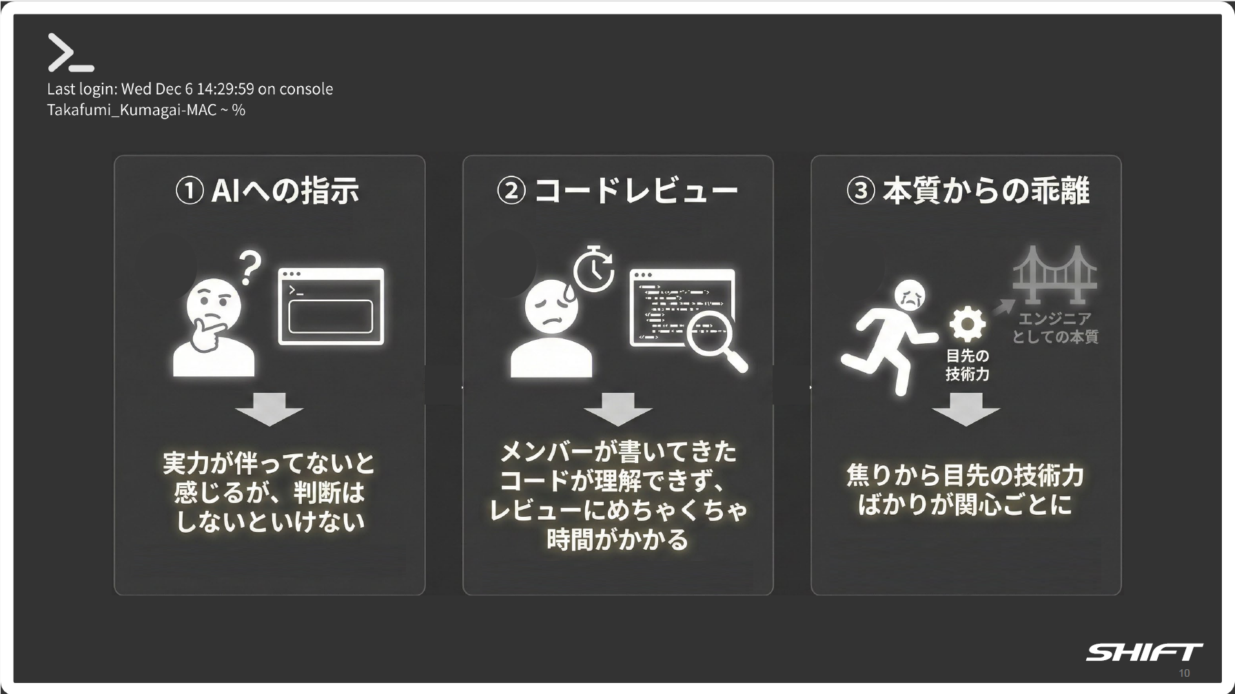 「物事は進んでいくのに自分だけ取り残された」という焦燥感。それを埋めようと目先の技術力にフォーカスし、小手先の戦術に頼ってしまう。しかしAI駆動開発を用いたプロジェクトのリーダーになった今、手を動かす機会は確実に減っている。「コーディングの機会が少ない中で、実力をつけていくために何ができるのか」──これが熊谷氏の問題提起だった。