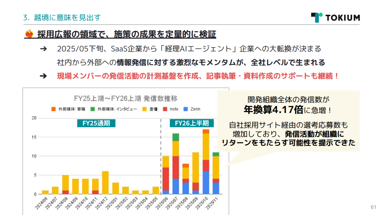 さらに2025年5月、TOKIUMは「SaaS企業から経理AIエージェント企業への大転換」を発表した。「経理AIエージェントのカテゴリーで国内ナンバーワンの認知を取りにいく」という目標が生まれ、社内から外部への情報発信に対する強い機運が全社レベルで生じた。