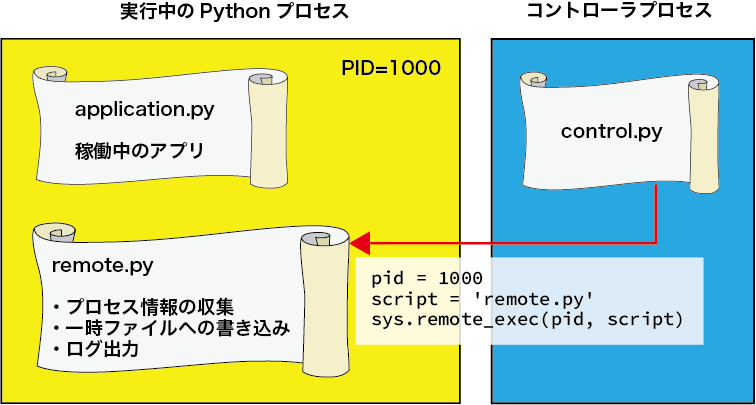 この関数は、PythonプロセスのIDと実行したいPythonスクリプトのパスを受け取り、プロセス上でのスクリプトの実行を指示します。Pythonプロセス側では、プロセスを再起動することなく、指示されたスクリプトを実行します。スクリプトには、プロセス情報を取得して一時ファイルに書き込んだり、ログ出力したりといった処理を記述することになります。
