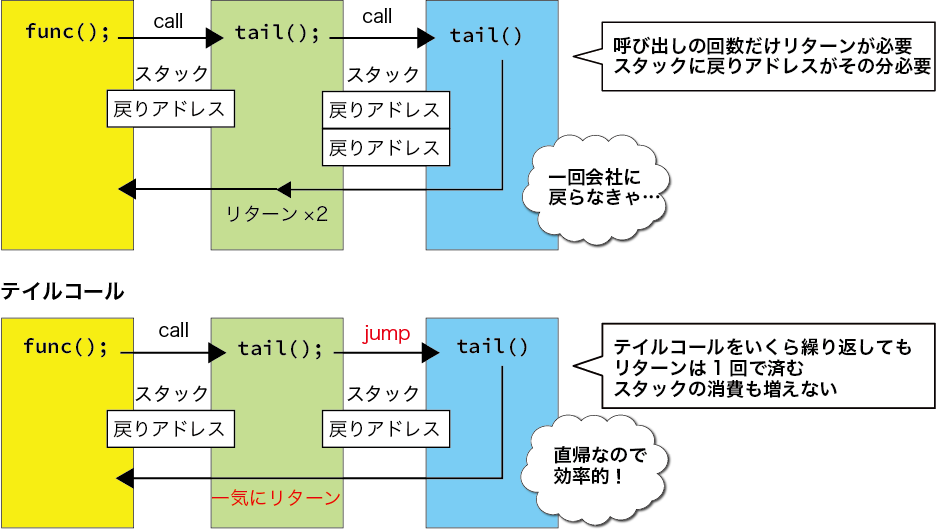 テイルコールとは、ある関数最後の別関数の呼び出しをジャンプ命令に置き換えて、別関数から一気に最初の呼び出し元に戻る最適化技法です(ビジネスマンの「直帰」のようなイメージです)。時間のかかるスタック操作と戻り位置のためのメモリを節約し、実行性能の向上を図ります。