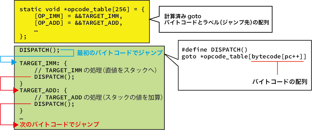 この手法のポイントは、あるバイトコードの処理が終了した時点で、次のバイトコードに対応するラベルへジャンプしてしまうことです。これにより、余計なジャンプを省略することができ、CPUの分岐予測の精度も高めることができることから、単なるswitch~case文で仕分けるよりも性能の向上が図れます。
