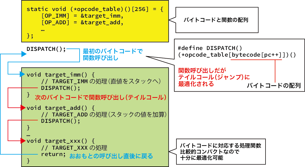 バイトコードの各処理を関数に分離したら、最適化も実行しやすくなり、コードの見通しがよくなりますが、今度は関数呼び出しのためのオーバーヘッドが発生します。そこで、テイルコールによって最後の関数呼び出しをジャンプ命令に置き換え、スタック操作を最小限にして実行効率の向上を図ります。