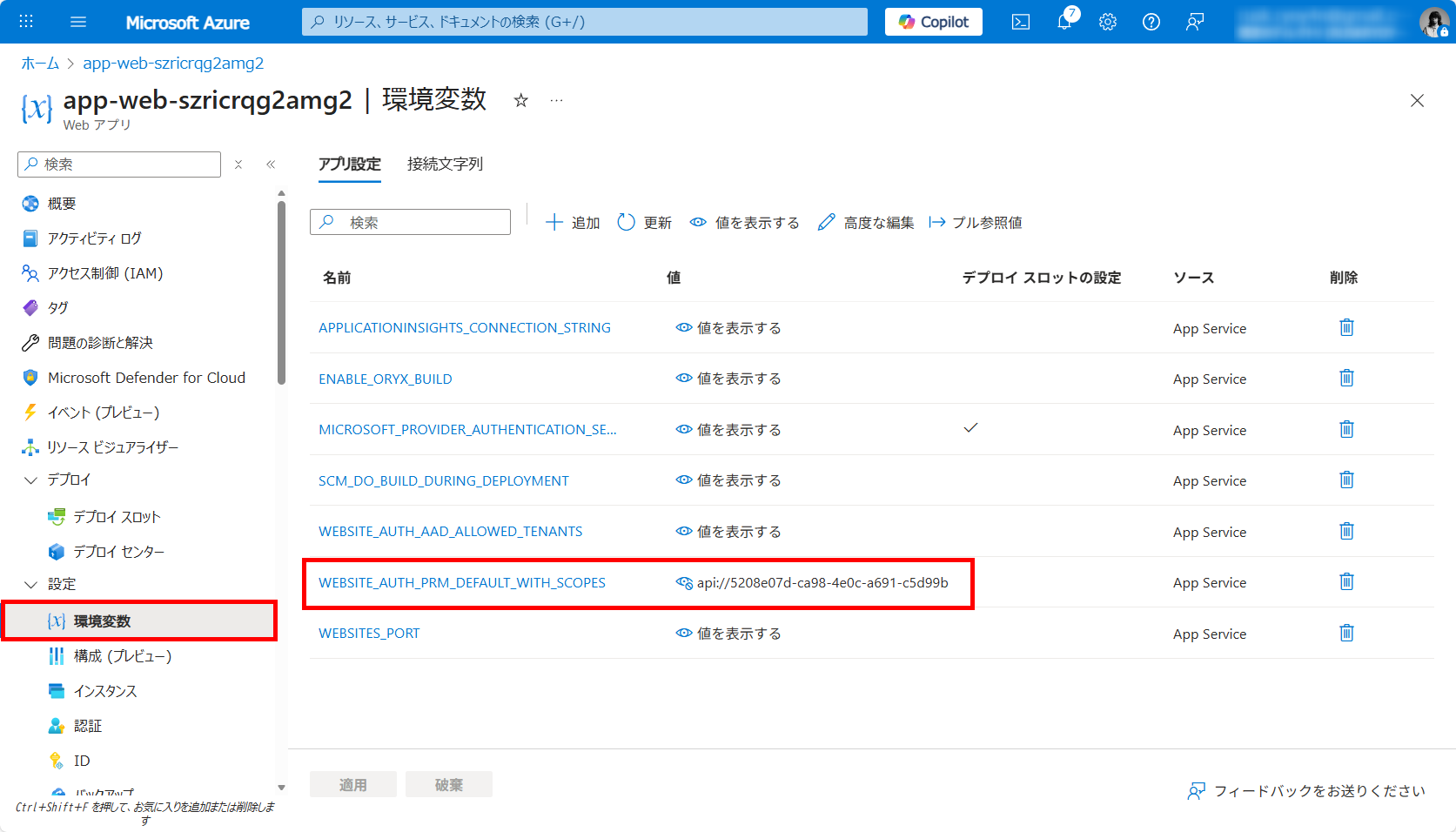 App Serviceの環境変数に承認済みスコープを追加