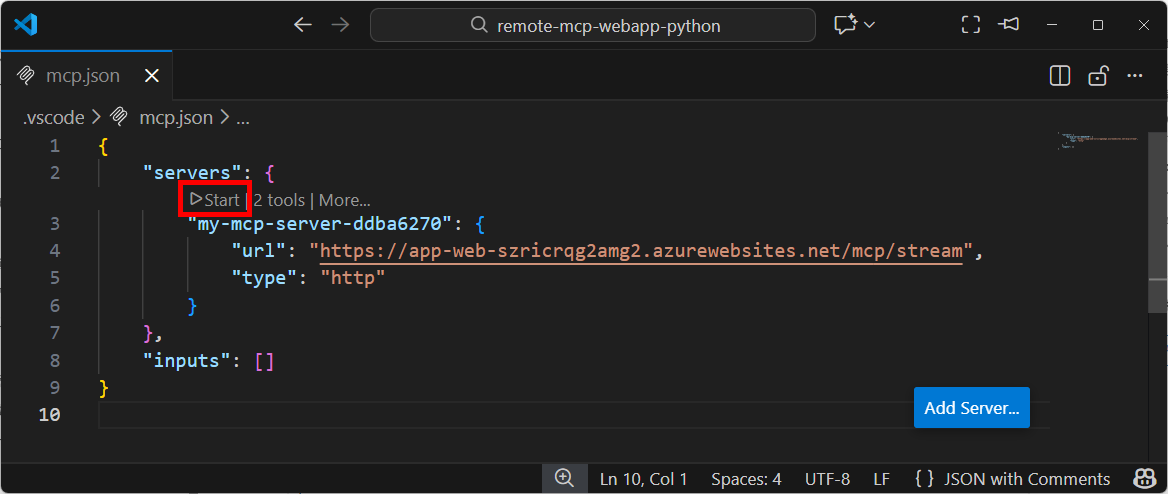 • サーバーURL:https://<your-app-service-name>.azurewebsites.net/mcp/stream